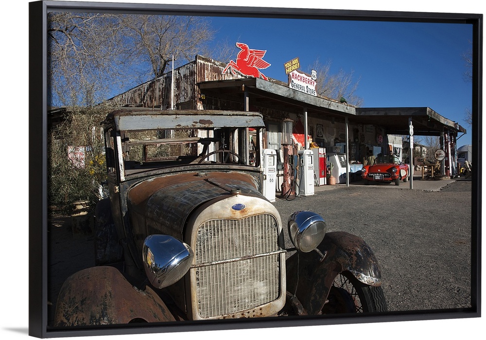 <p>Photograph of vintage car at old garage and gas station.</p>