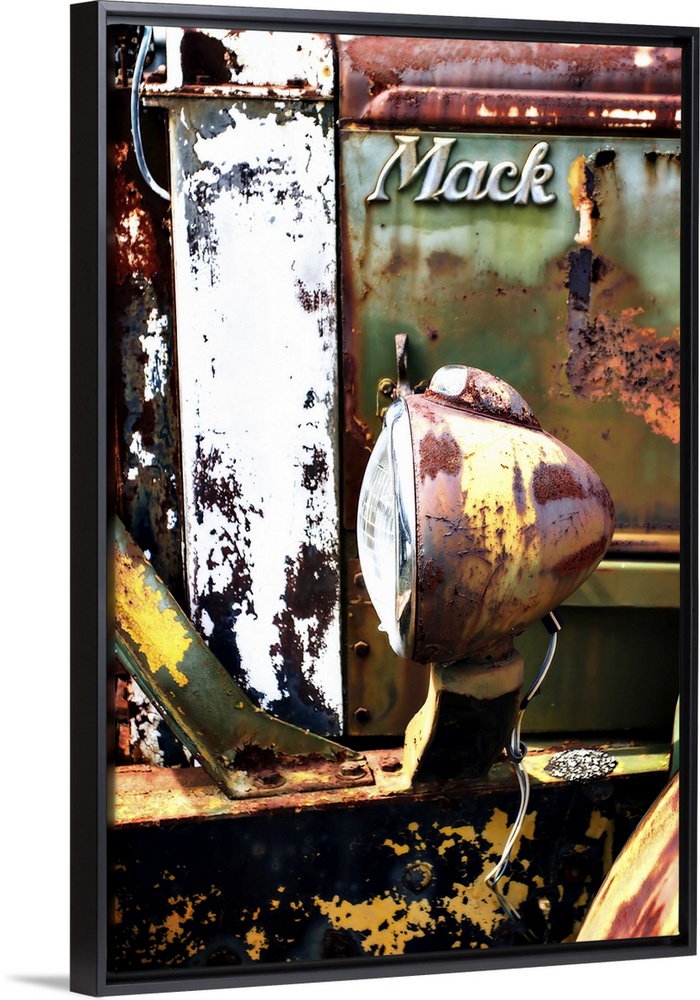 <p>Close-up photograph of Mack truck headlight covered in rust and texture.</p>