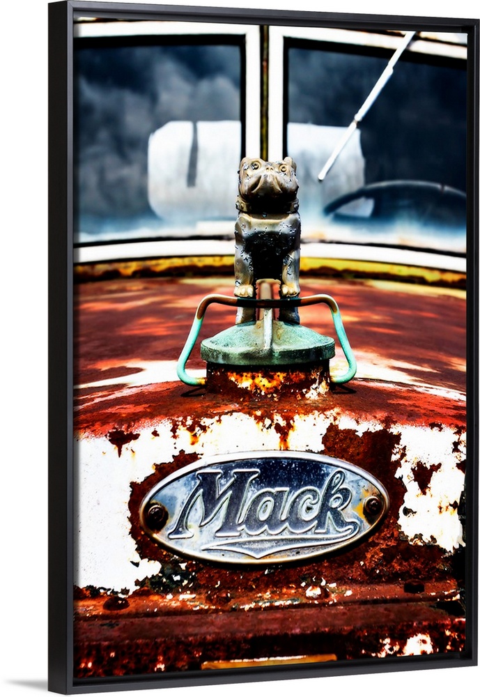 <p>Photograph of the front of an old, rusted Mack truck.</p>