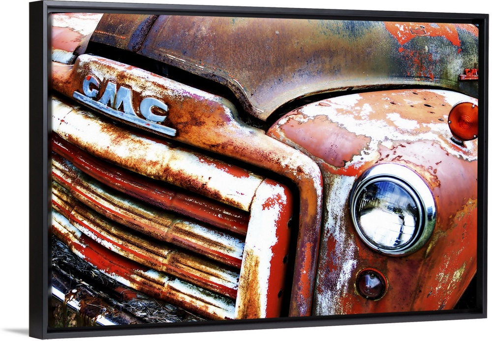 <p>Photograph of the front of an old, rusted, orange GMC truck.</p>