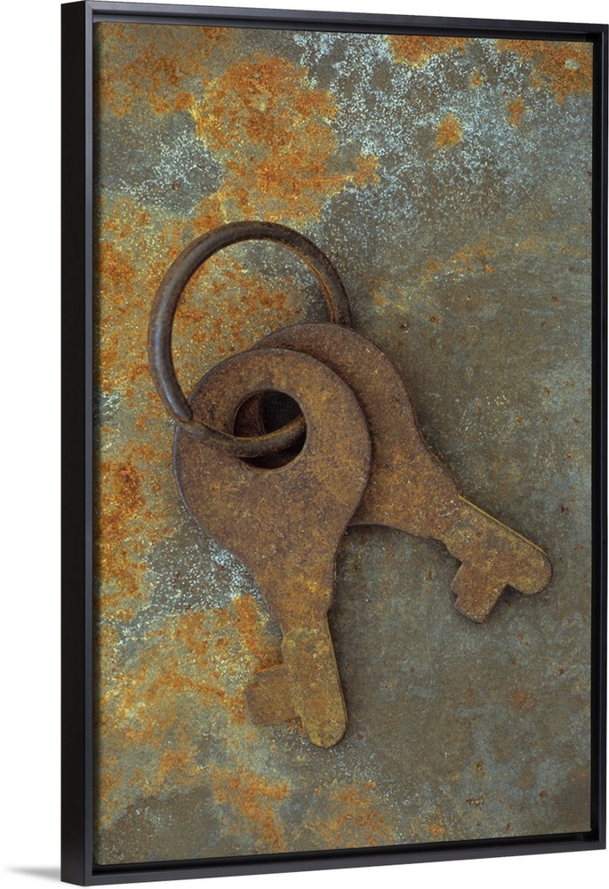 <p>Two small simple rusty keys on keyring lying on rusty metal sheet</p>