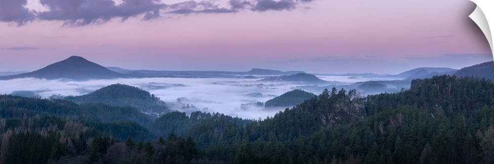 <p>Ruzovsky vrch hill around fog and Jetrichovice at sunrise, Rynartice, Jetrichovice, Okres Decin, Ustecky kraj Province, Bohemian Switzerland National Park, North-Western Czech Republic, Czech Republic</p>