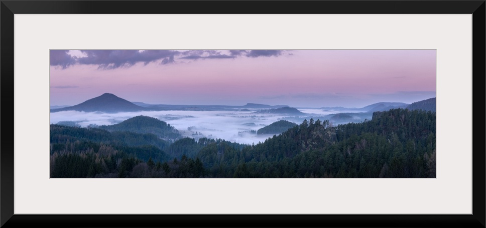 <p>Ruzovsky vrch hill around fog and Jetrichovice at sunrise, Rynartice, Jetrichovice, Okres Decin, Ustecky kraj Province, Bohemian Switzerland National Park, North-Western Czech Republic, Czech Republic</p>