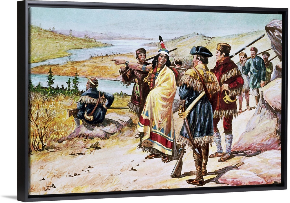 <p>Lewis and Clark expedition - Sacajawea guiding the expedition from Mandan through the Rocky Mountains. Painting by Alfred Russell. Color slide.</p>