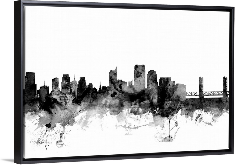 <p>Contemporary artwork of the Sacramento city skyline in black watercolor paint splashes.</p>