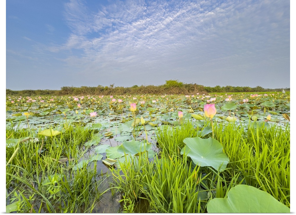 <p>Sacred lotus (Nelumbo nucifera), at sunrise in Kampong Tralach, Cambodia, Indochina, Southeast Asia, Asia</p>