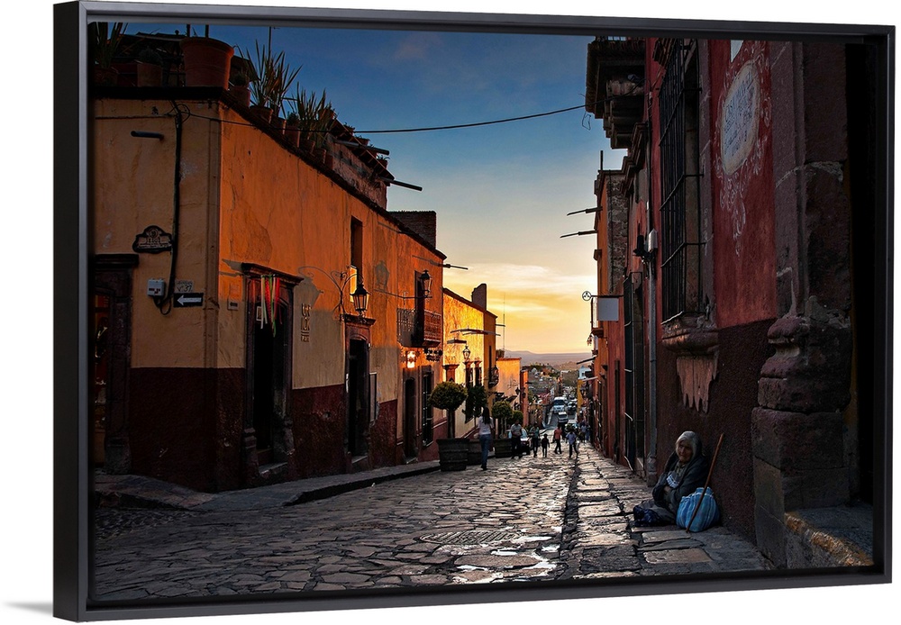<p>Looking down the street of a Mexican city at dusk.</p>