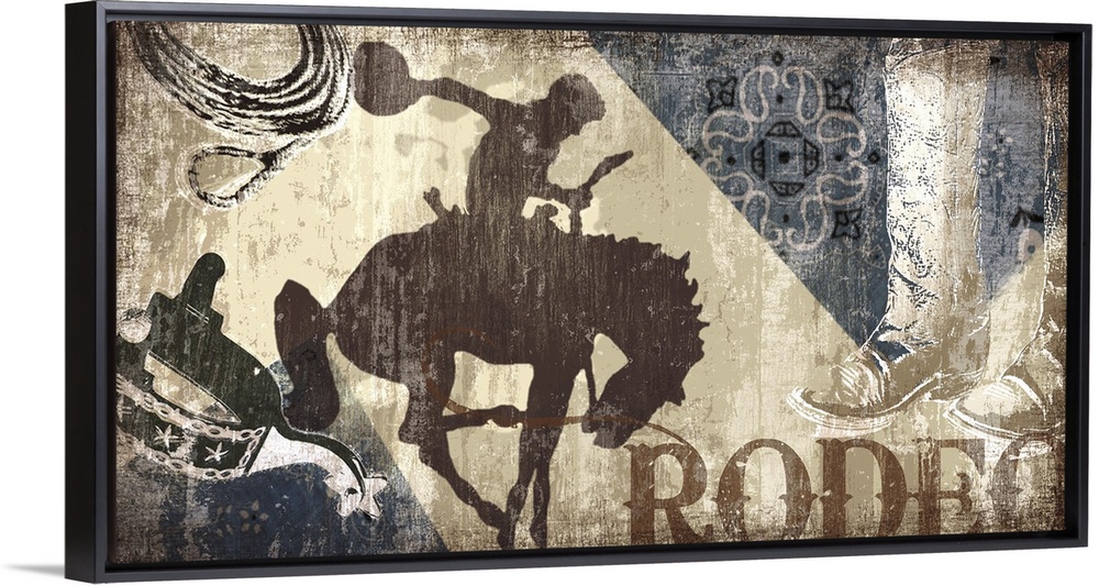 <p>"Rodeo" artwork with cowboy boots, spurs, rope and a man riding a horse.</p>