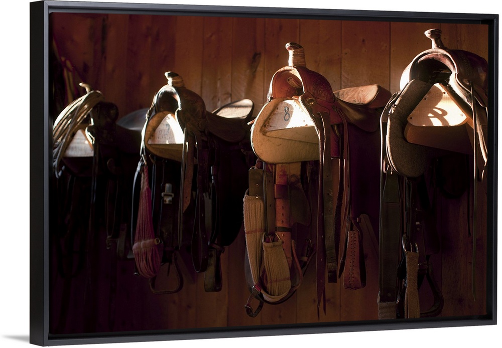 <p>USA, Colorado, Saddles in barn</p>