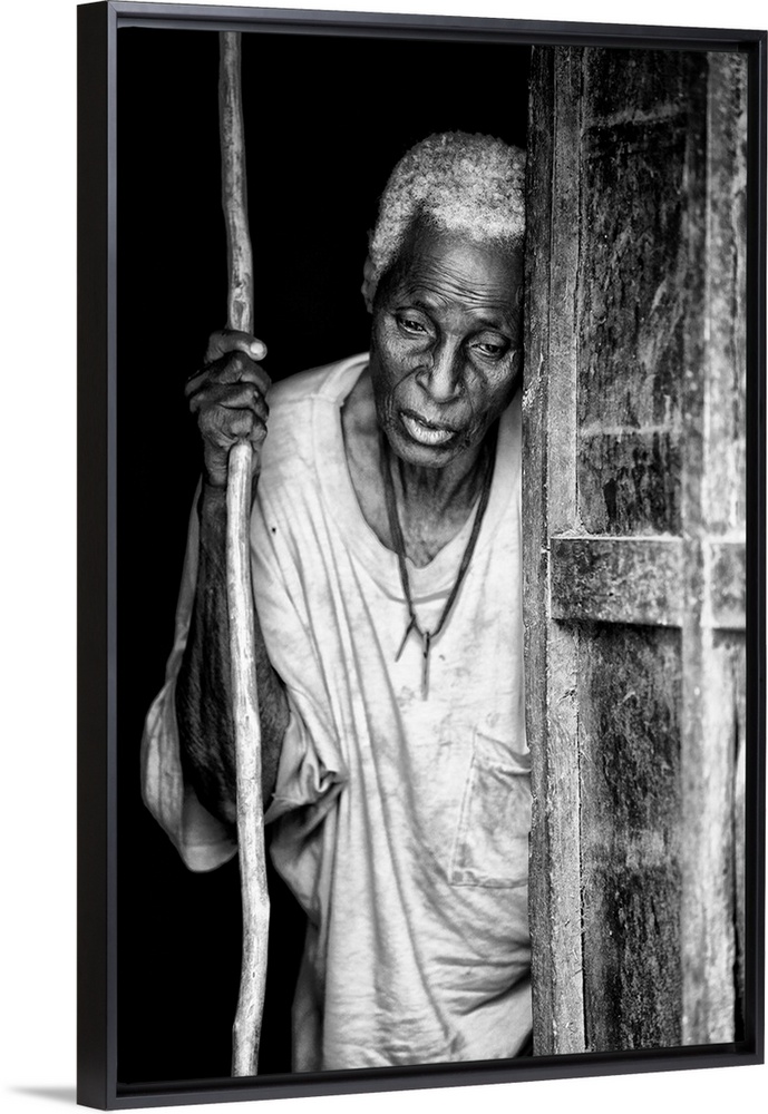 <p>Black and white portrait of an elderly person with a staff in a doorway.</p>
