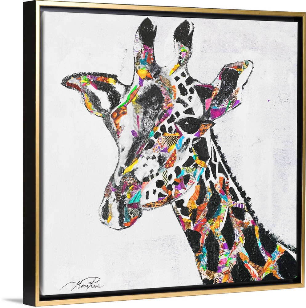 <p>Contemporary painting of a giraffe with bright colors and patterns between the spots.</p>