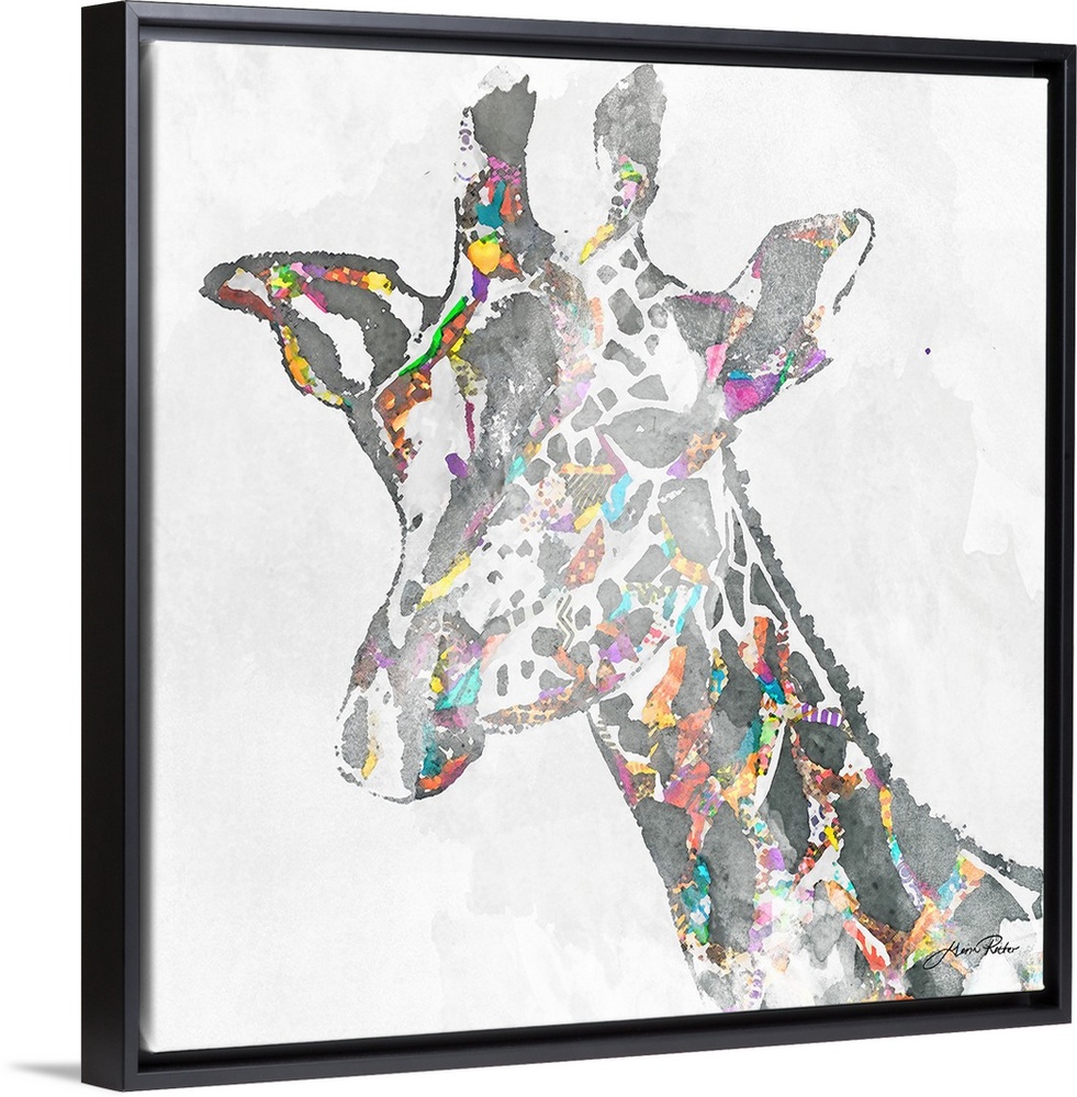 <p>Portrait of a giraffe embellished with vivid colors.</p>