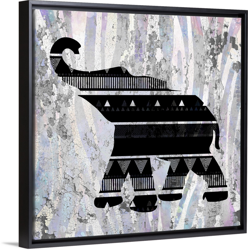 <p>A black designed silhouette of an elephant on a colorful textured background.</p>