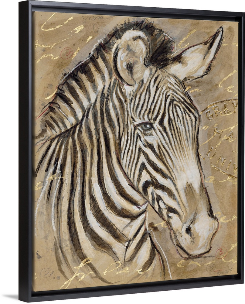 <p>Portrait of a zebra in brown tones with golden writing.</p>