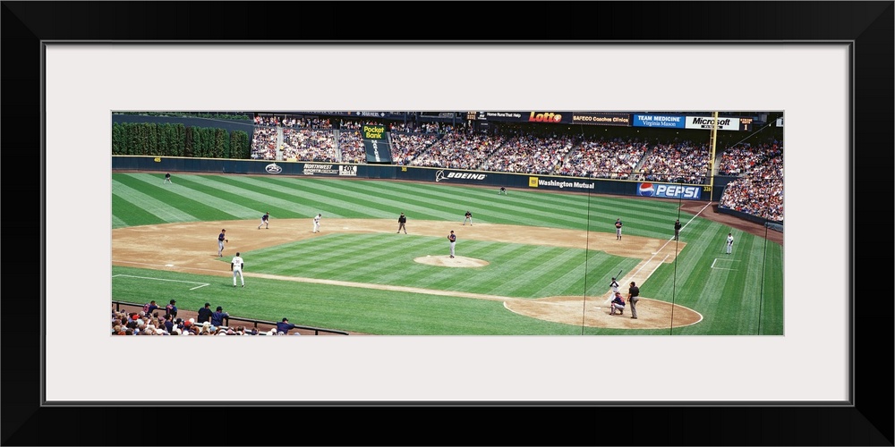 <p>Panoramic photograph is taken inside the Seattle Mariners baseball stadium as they play a game and the stands are packed with fans.</p>