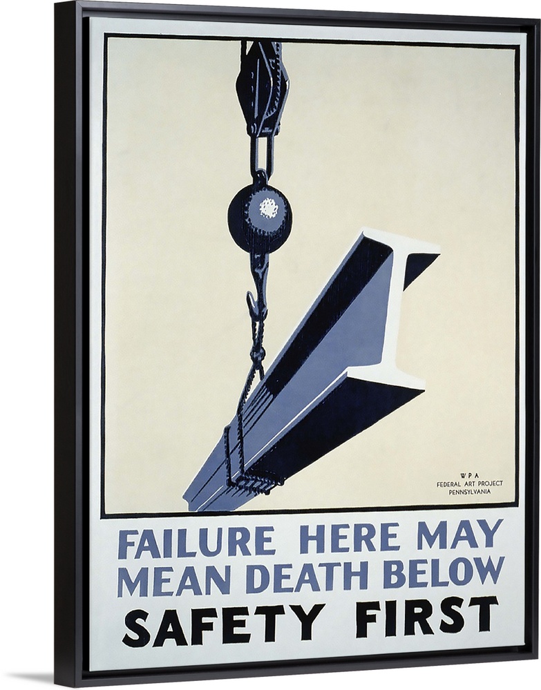 <p>Failure here may mean death below. Safety First! Poster promoting safety in the workplace, showing a steel girder suspended from a cable. Library of Congress, Prints and Photographs Division, WPA Poster Collection.</p>
