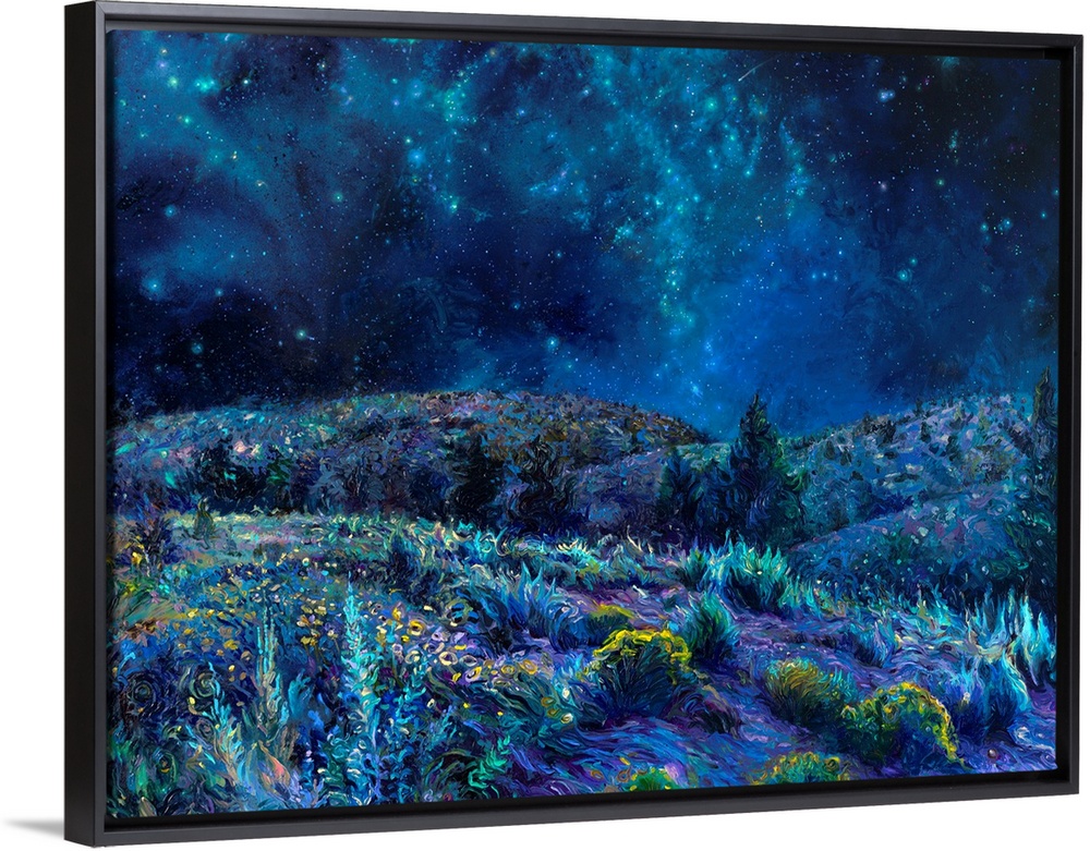 <p>Brightly colored contemporary artwork of a cool toned landscape of the night sky and a field.</p>