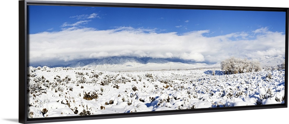 <p>Sage covered with snow with Taos Mountain in the background, Sangre De Cristo Range, San Luis Valley, Colorado, USA.</p>