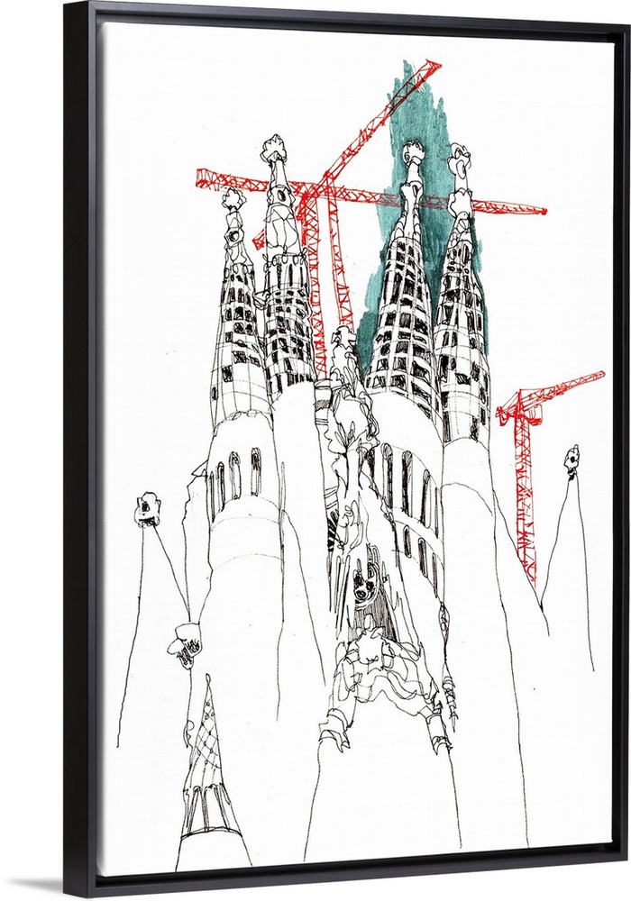 <p>Drawing I made at the foot of the famously under construction cathedral by Gaudi. I used a minimal approach to capture selective details in the architecture, and included the cranes in red because, let's face it, they're almost part of the building at this point! And their geometric, straight shapes add something in contrast to the organic forms.</p>