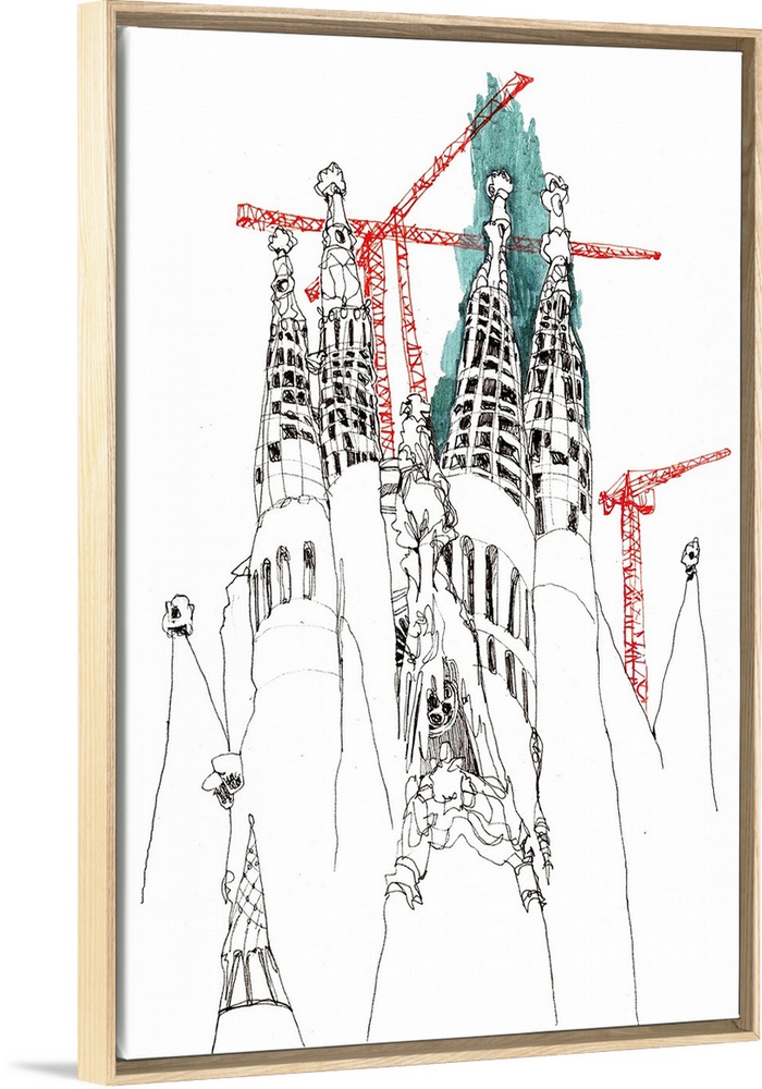 <p>Drawing I made at the foot of the famously under construction cathedral by Gaudi. I used a minimal approach to capture selective details in the architecture, and included the cranes in red because, let's face it, they're almost part of the building at this point! And their geometric, straight shapes add something in contrast to the organic forms.</p>