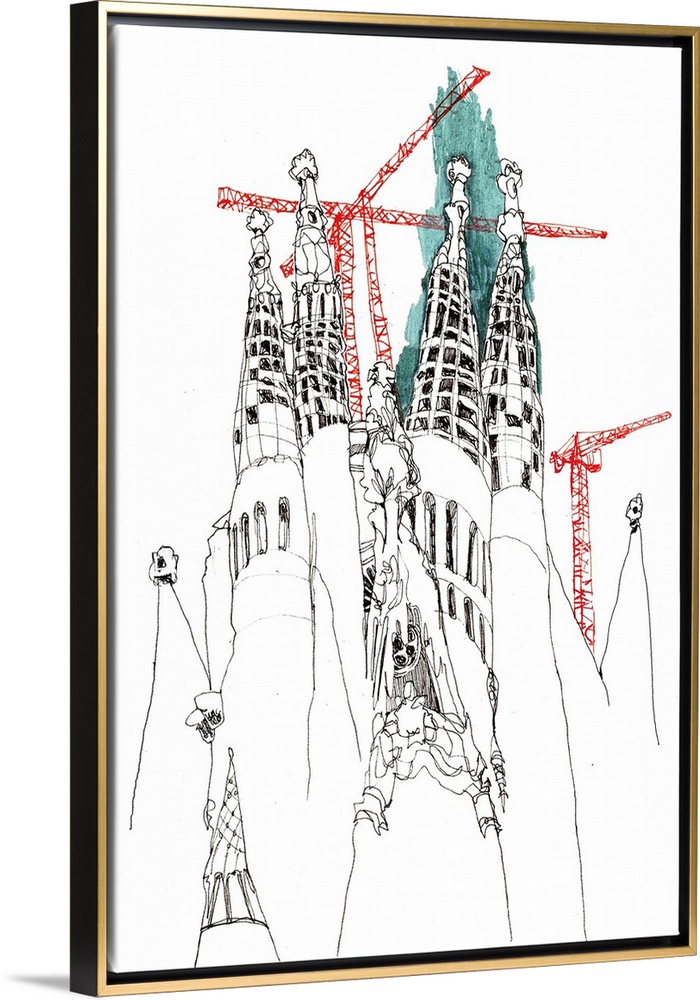 <p>Drawing I made at the foot of the famously under construction cathedral by Gaudi. I used a minimal approach to capture selective details in the architecture, and included the cranes in red because, let's face it, they're almost part of the building at this point! And their geometric, straight shapes add something in contrast to the organic forms.</p>