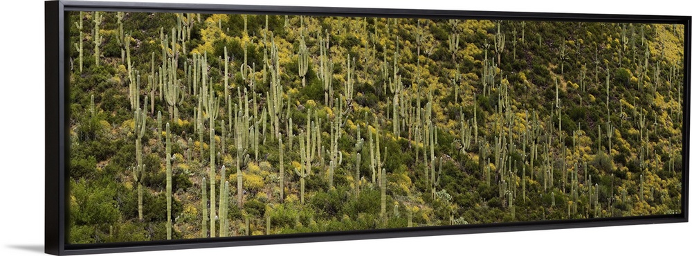 <p>Saguaro cacti (Carnegiea gigantea) and Brittlebush on a landscape, Arizona, USA</p>