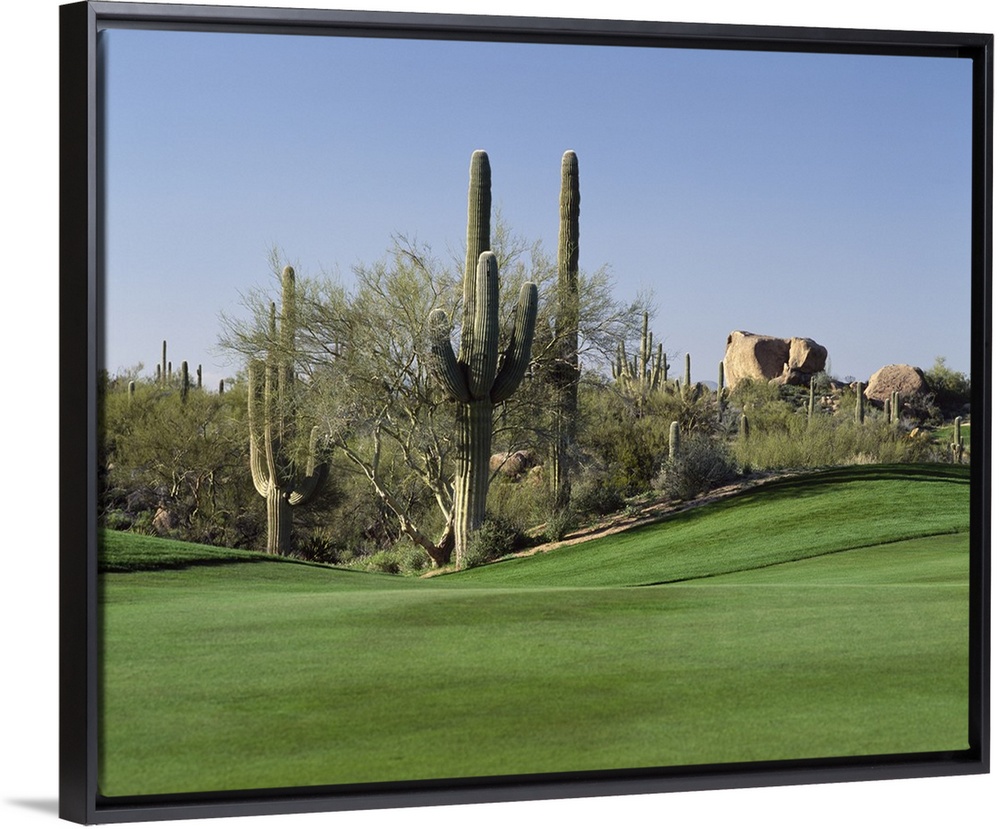 <p>Group of cactuses decorating the edge of a well-manicured lawn on a golf course, with big rocks in the background.</p>