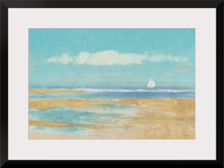 <p>Contemporary artwork of a sandy beach with a sailboat on the horizon.</p>