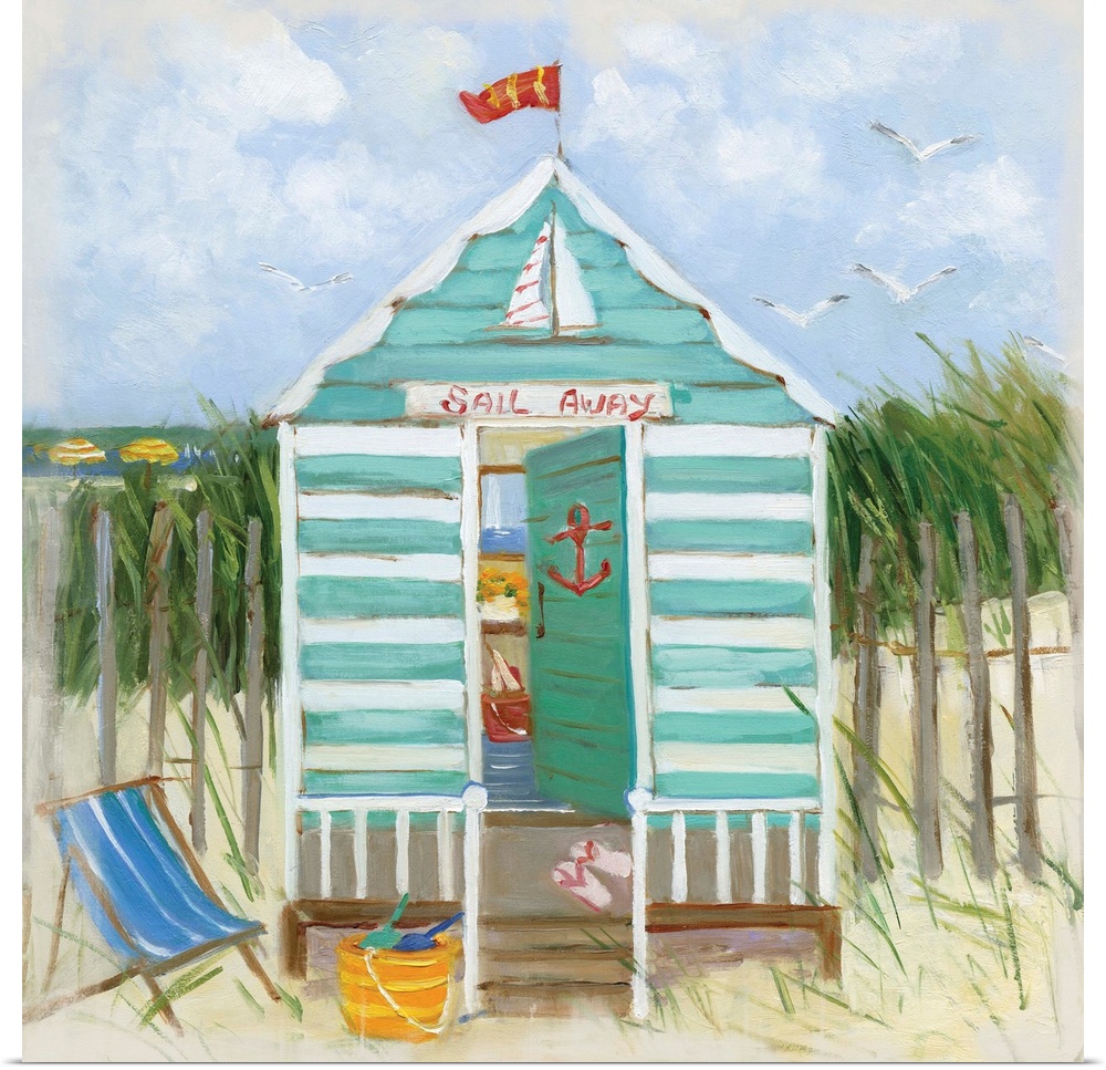 <p>Square painting of a teal and white beach hut with the ocean in the distance.</p>