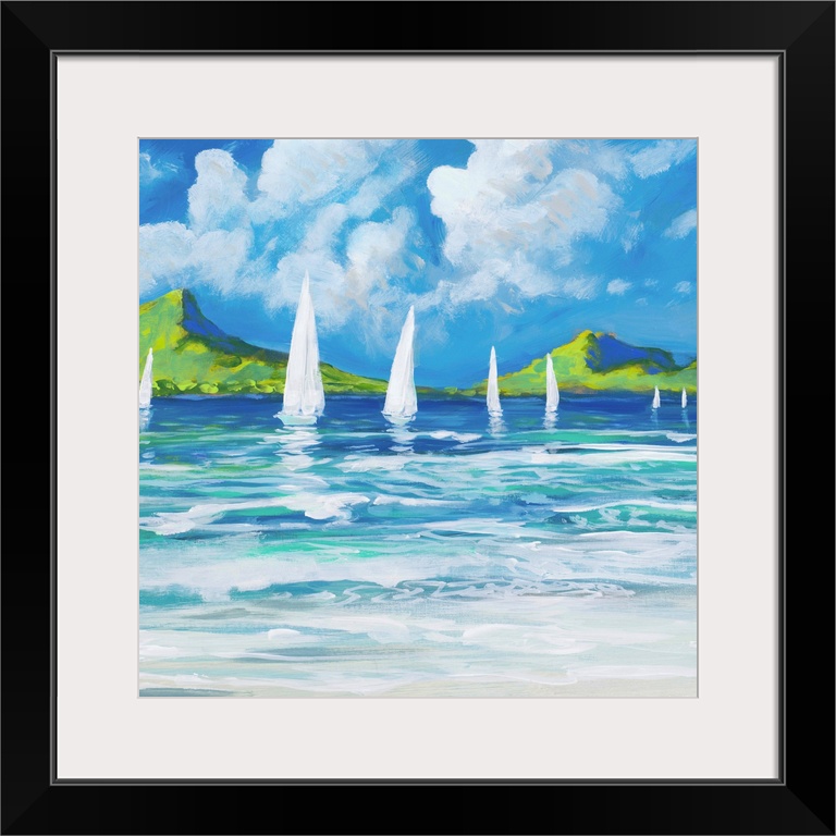 <p>Contemporary painting of white sailboats on the ocean, seen from the shore.</p>