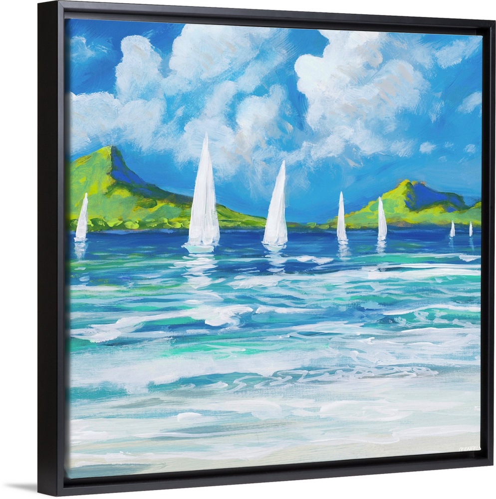 <p>Contemporary painting of white sailboats on the ocean, seen from the shore.</p>