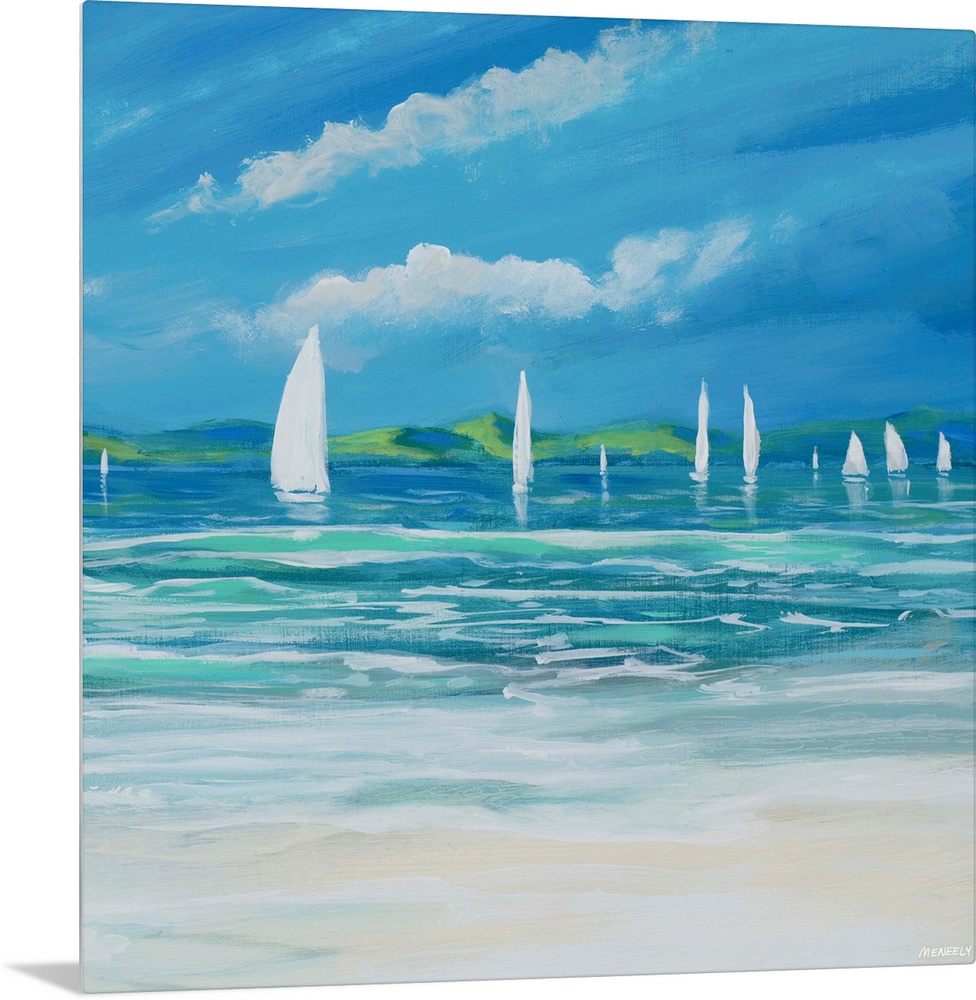 <p>Contemporary painting of white sailboats on the ocean, seen from the shore.</p>