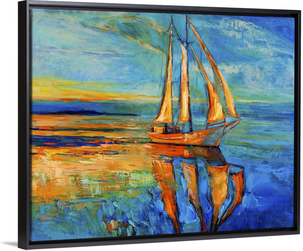 <p>Originally an oil painting of a ship and sea on canvas. Sunset over ocean. Modern impressionism.</p>