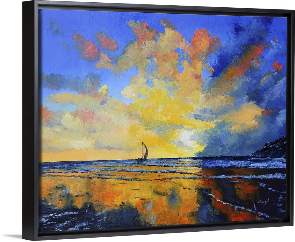 <p>Painting of a sailboat on a calm sea at sunset.</p>