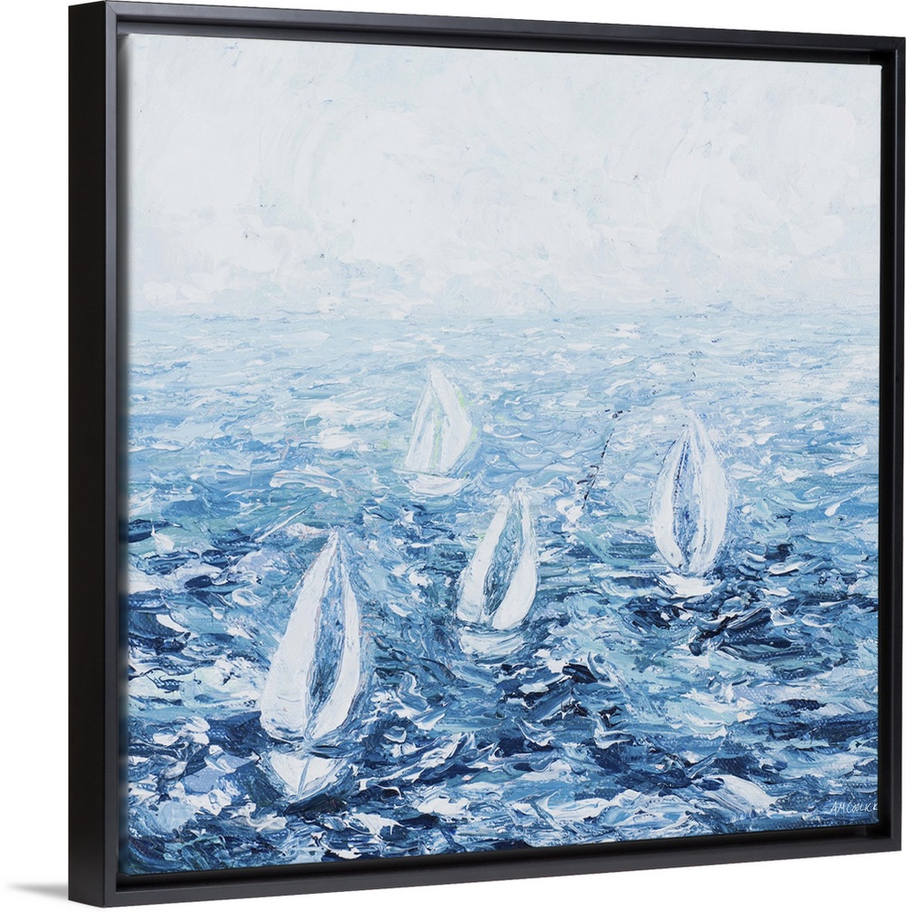 <p>A cool toned contemporary abstract painting of four white sail boats on choppy ocean water.</p>