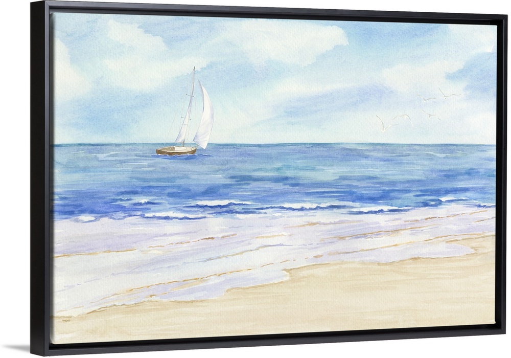 <p>A visionary watercolor scene of calm ocean waves on a beach with a sailboat and seagulls off in the distance.</p>