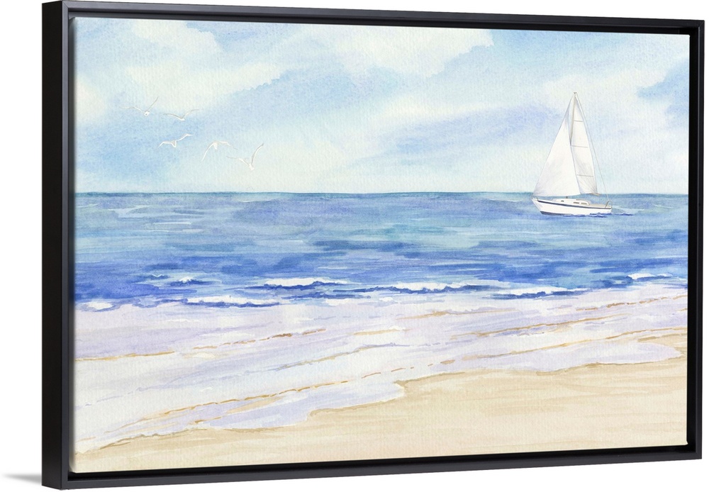 <p>A visionary watercolor scene of calm ocean waves on a beach with a sailboat and seagulls off in the distance.</p>