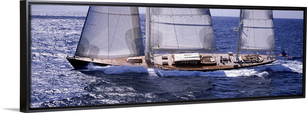 <p>Large, horizontal photograph of a sailboat, slightly tilting as it charges through the blue waters of Antigua.</p>