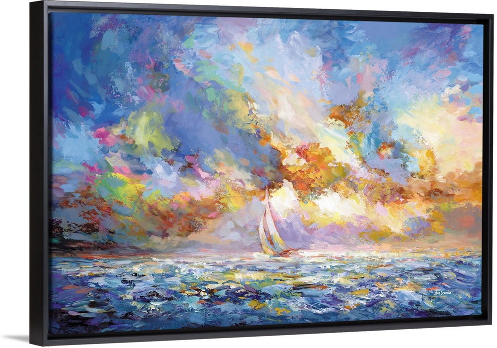 <p>A sailboat moves across a glowing sea beneath a sky bursting with expressive color. Strokes of blue, gold, violet, and coral swirl together, filling the scene with movement and light. This contemporary seascape captures a vivid moment of motion, contrast, and atmosphere.</p>