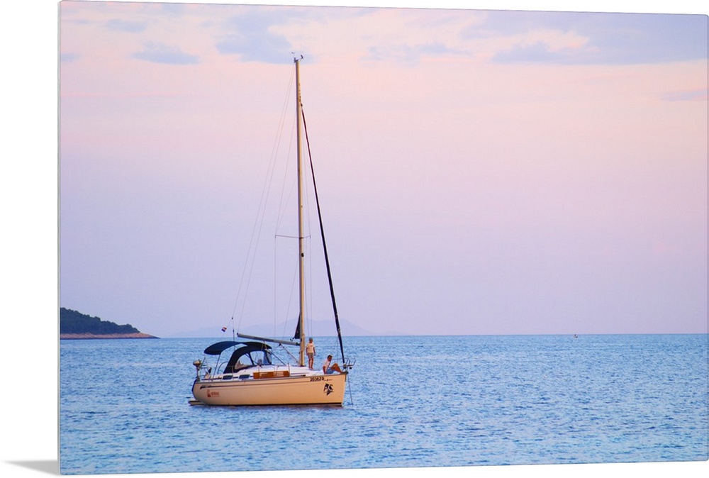 <p>A sailing boat moored in the bay with two people on the deck off Korcula at sunset. Prizba village. Korcula Island. Prizba, Riva Apartments, Danny Franulovic. Korcula Island. Dalmatian Coast, Croatia, Europe.</p>