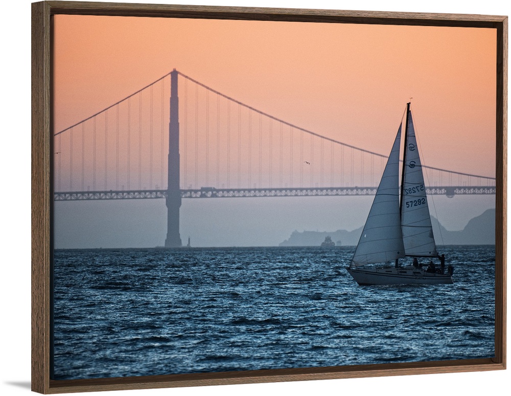 <p>Sunset photograph of a sailboat on the San Francisco Bay with the Golden Gate Bridge in the background.</p>