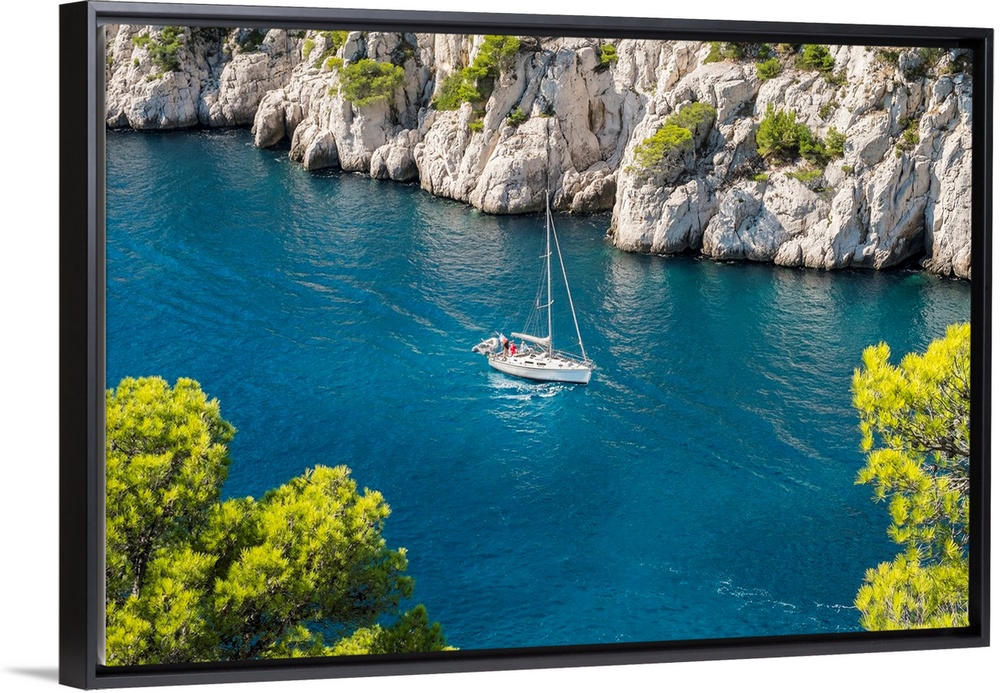 <p>Sailboat passing through emerald blue water of Calanque de Port-Pin, Cassis, Bouches-du-Rhone, Provence-Alpes-Cote d'Azur, France.</p>