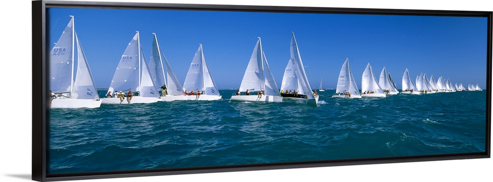 <p>Long and narrow photo print of sailboats lined up in the ocean for a race.</p>