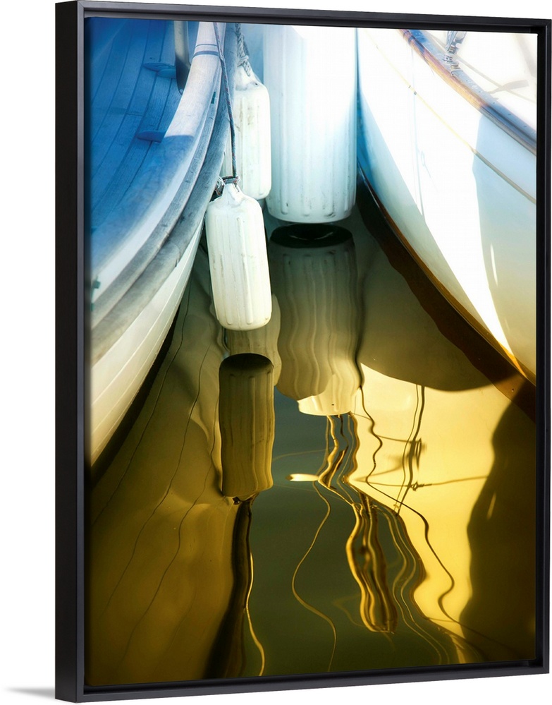 <p>Photograph of two boats, side by side, reflecting into the golden lit water.</p>