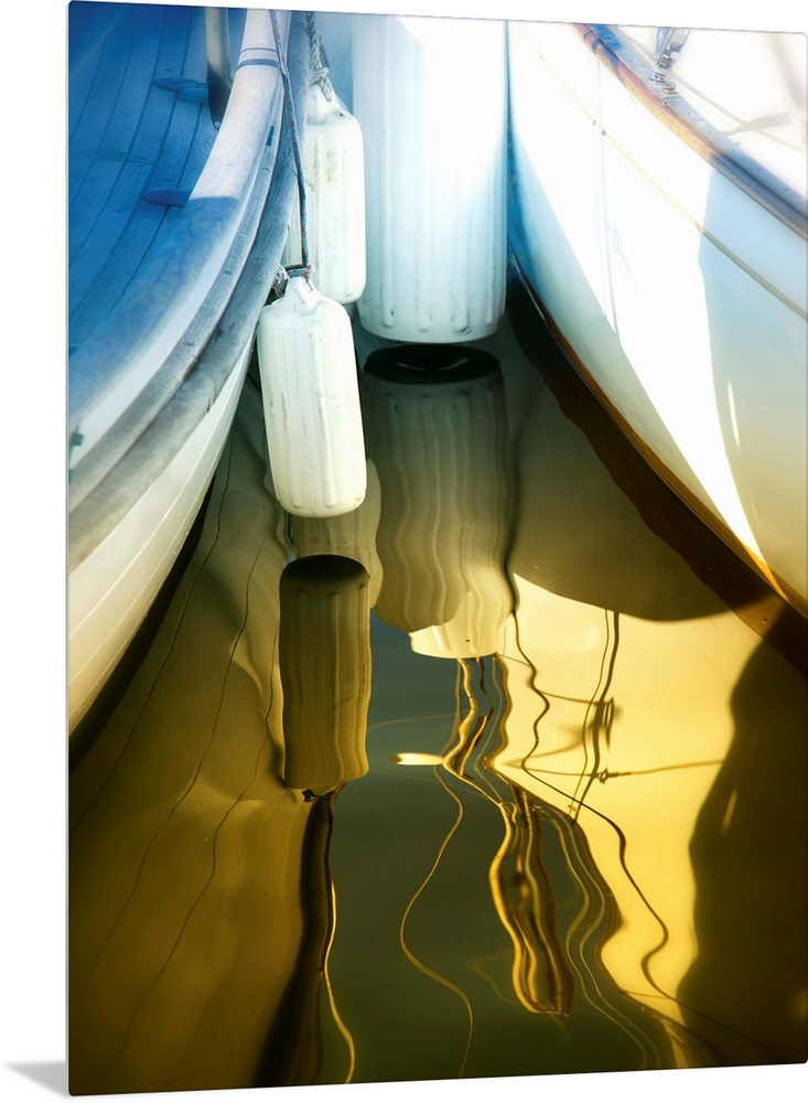 <p>Photograph of two boats, side by side, reflecting into the golden lit water.</p>