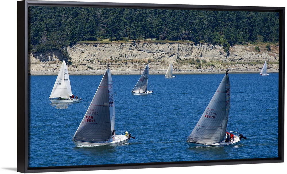 <p>A fleet of sailboats on the calm waters surrounding Whidbey Island, Washington, in the summer.</p>