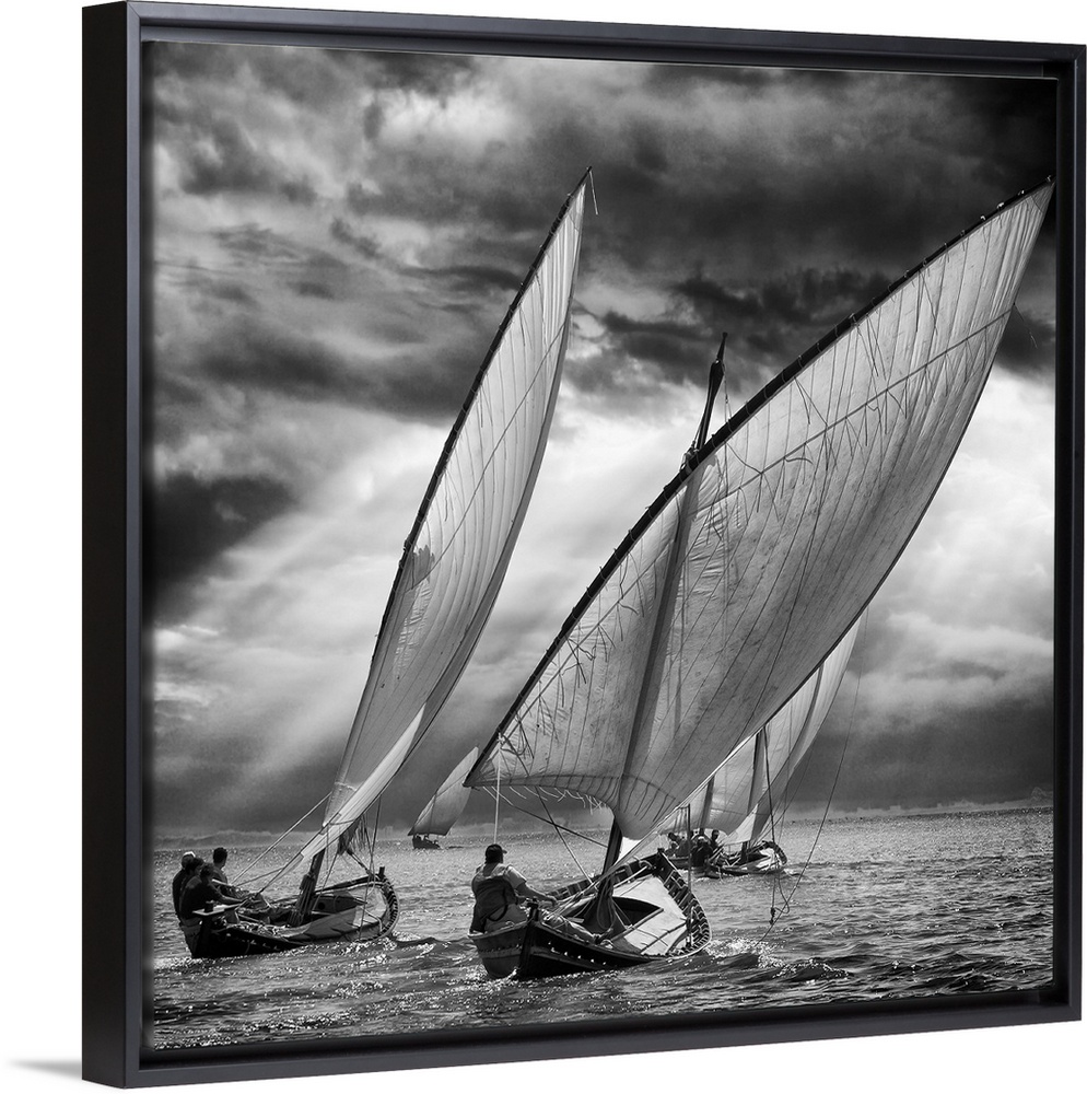 <p>Black and white image of a fleet of sailboats leaning in the wind under stormy skies.</p>