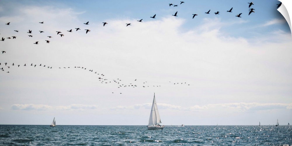 <p>Sailboats cruise the waters of Lake Ontario as a flock of water birds take to the air, Toronto, Ontario, Canada.</p>