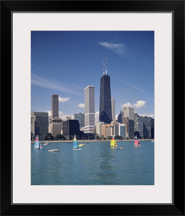 <p>Vertical photograph of several boats on Lake Michigan in front of Chicago skyscrapers in Illinois.</p>