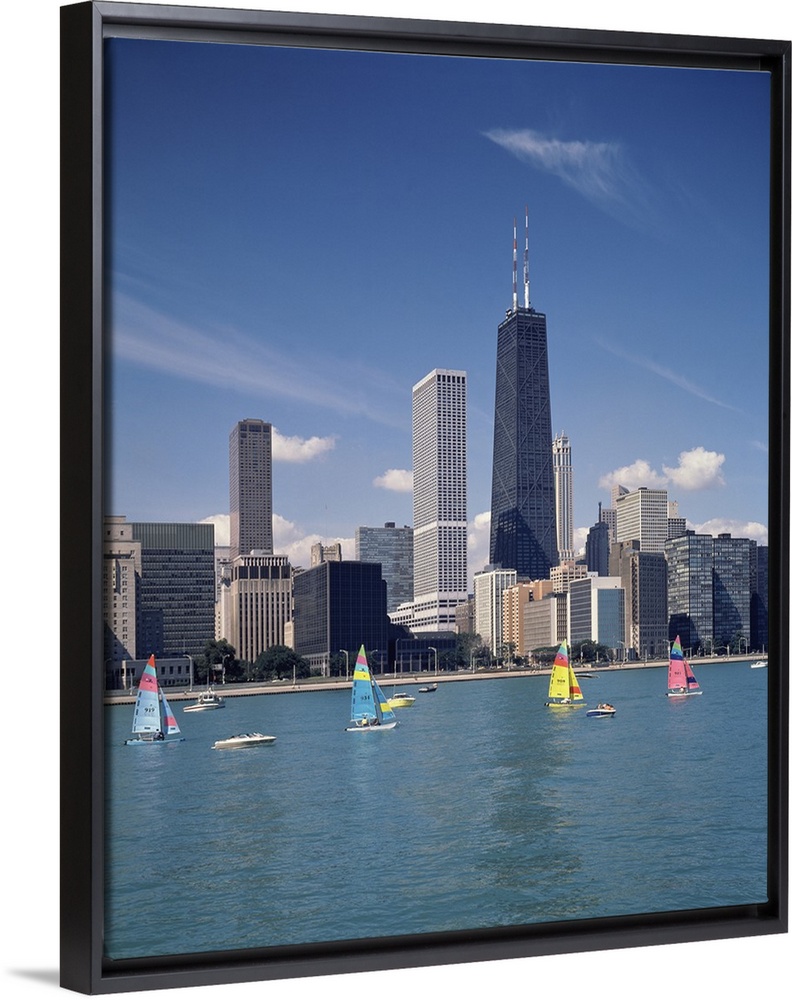 <p>Vertical photograph of several boats on Lake Michigan in front of Chicago skyscrapers in Illinois.</p>